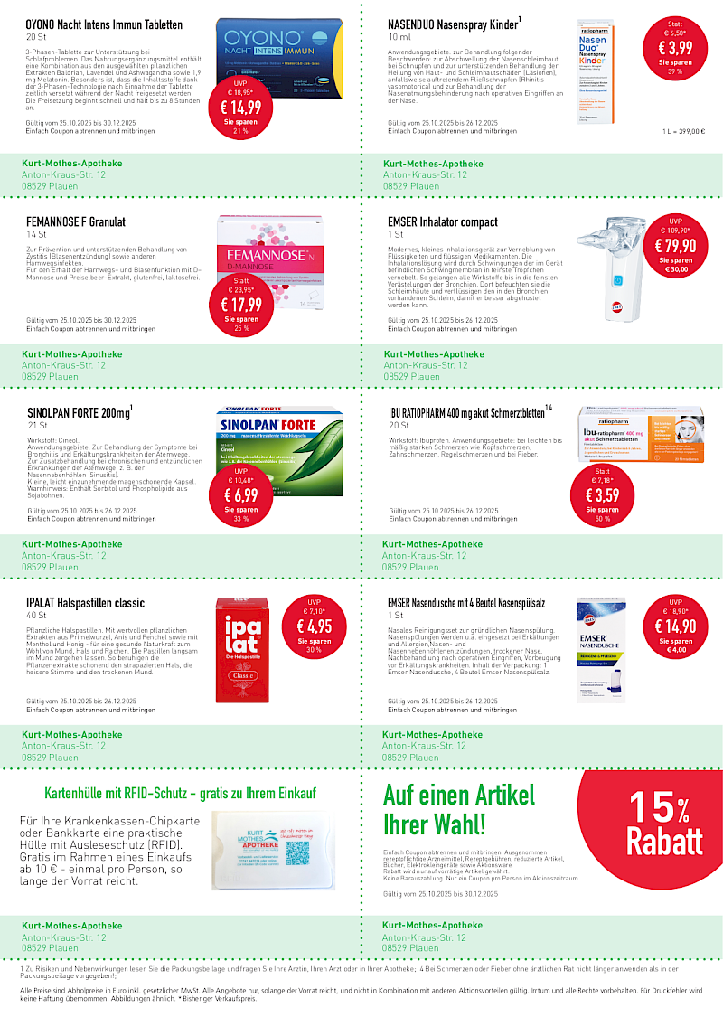 Alle gültigen Rabatt-Coupons oder Aktionspreise von Plauener Apotheken (z.B. über die Freie Presse) können Sie auch in Ihrer Kurt-Mothes-Apotheke einlösen. Dabei werden von uns schon gewährte Aktionsrabatte entsprechend verrechnet.
